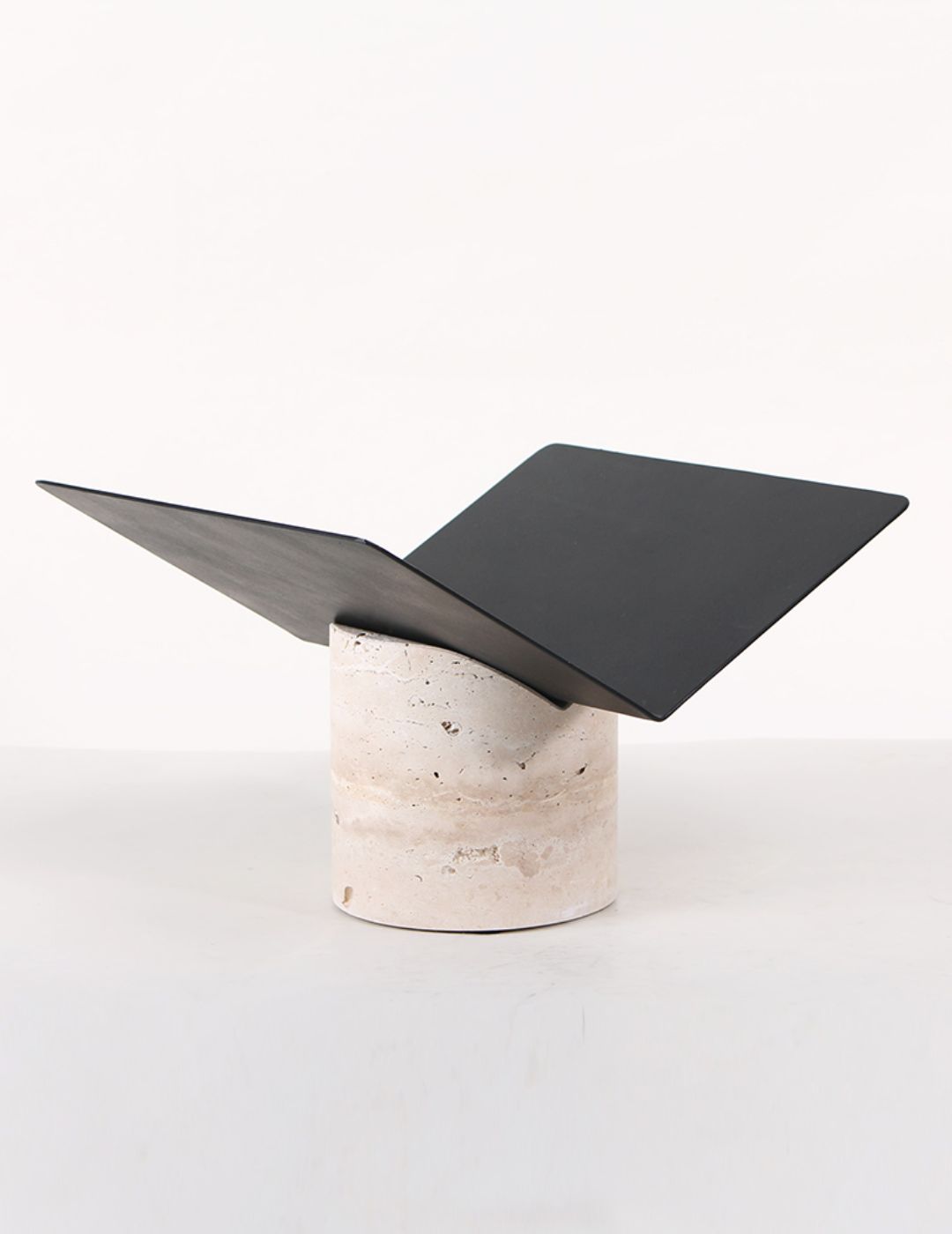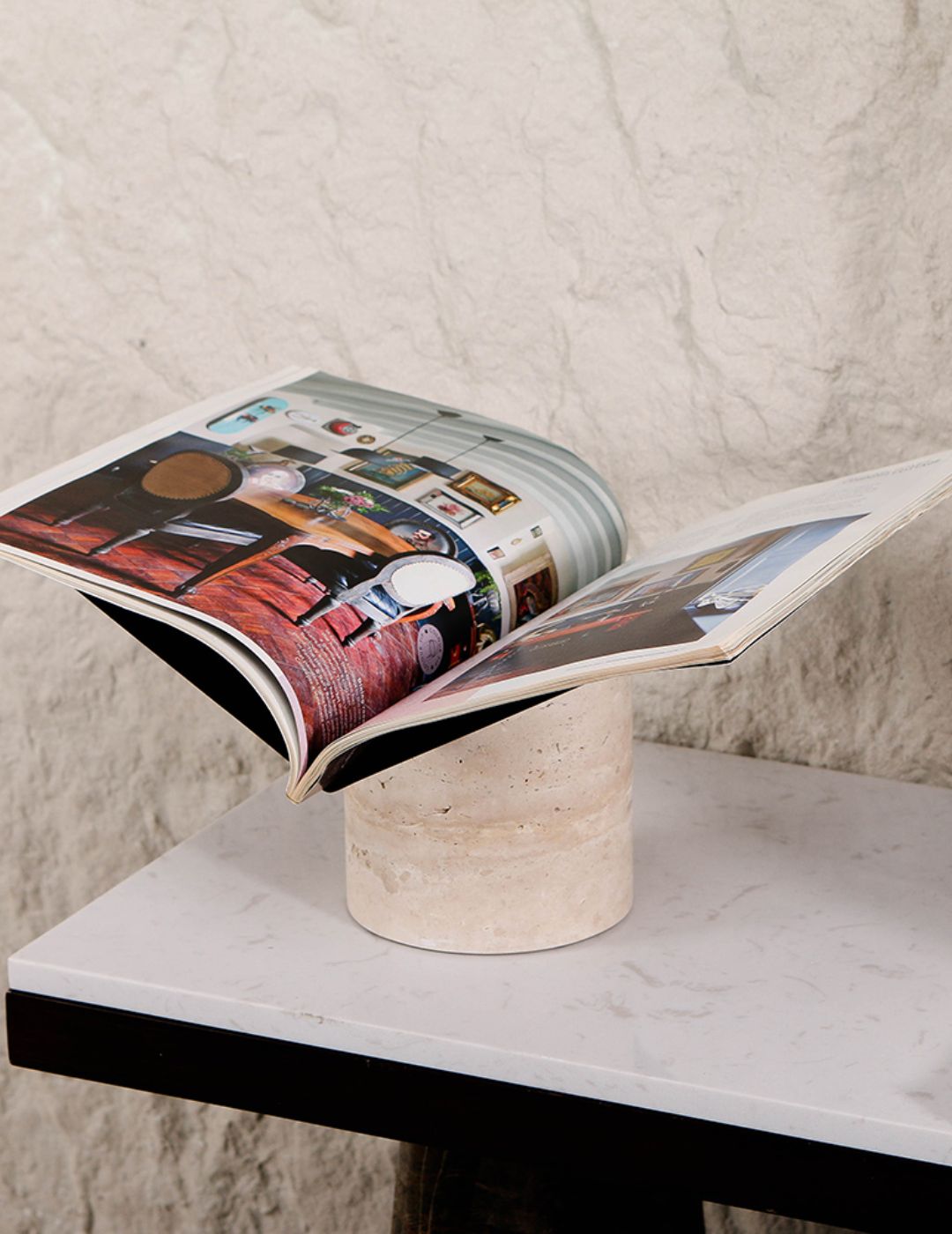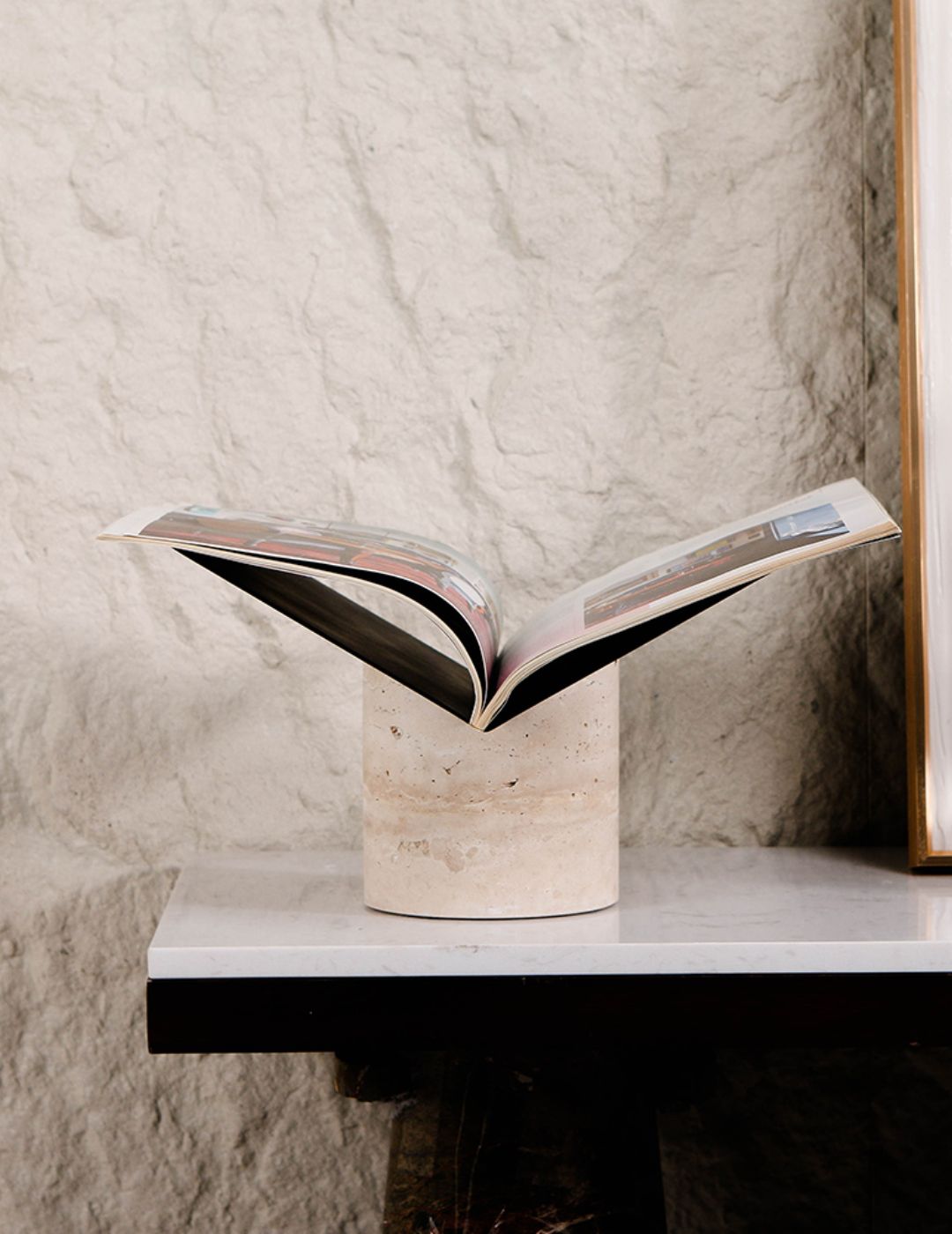 Inspired by classical architecture, this honed travertine base uses its cylindrical form to bring a soft, organic weight to your desk or shelf. The minimalist metal support elevates your favorite books at a curated angle, blending ancient mineral texture with contemporary design.