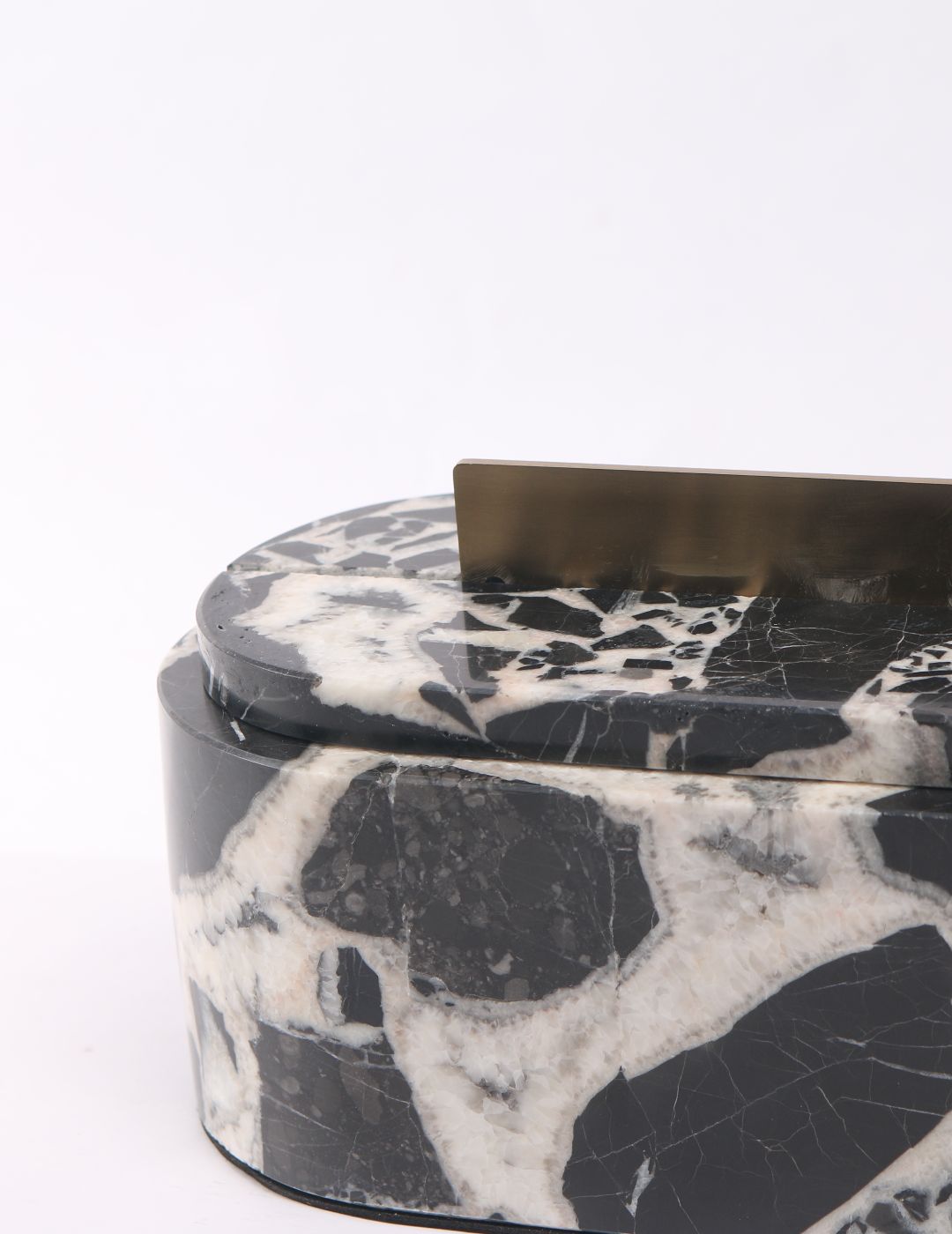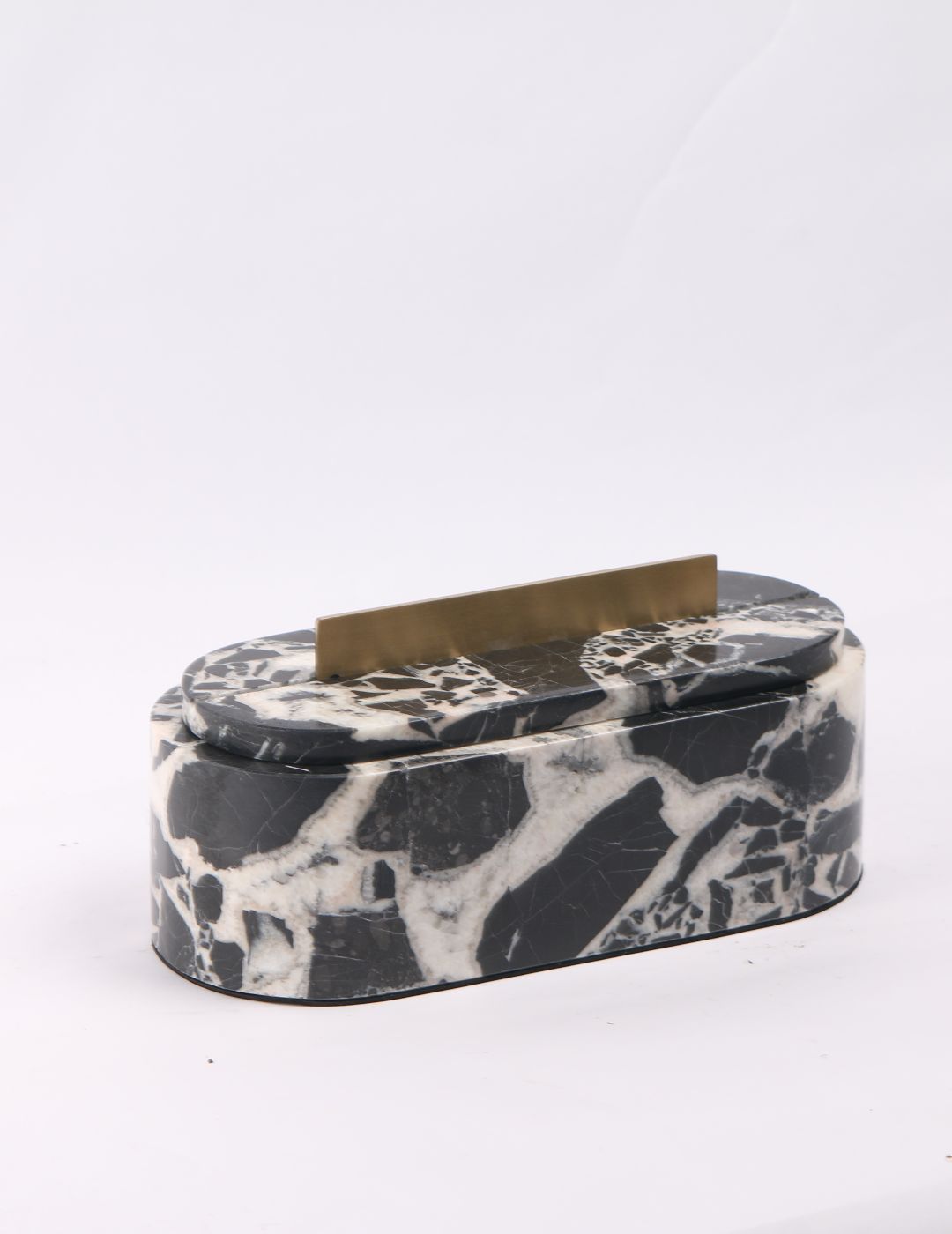 An elegant marble box featuring natural stone veining and a refined brass bar handle. Perfect for storing small essentials while adding a sophisticated accent to coffee tables, consoles, or bedside styling.