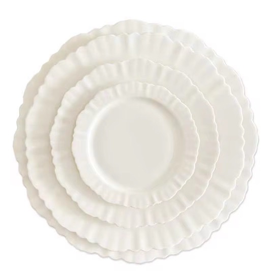Set of 4 Classic round ivory plates featuring delicate wave-edged rims and a smooth, softly contoured surface