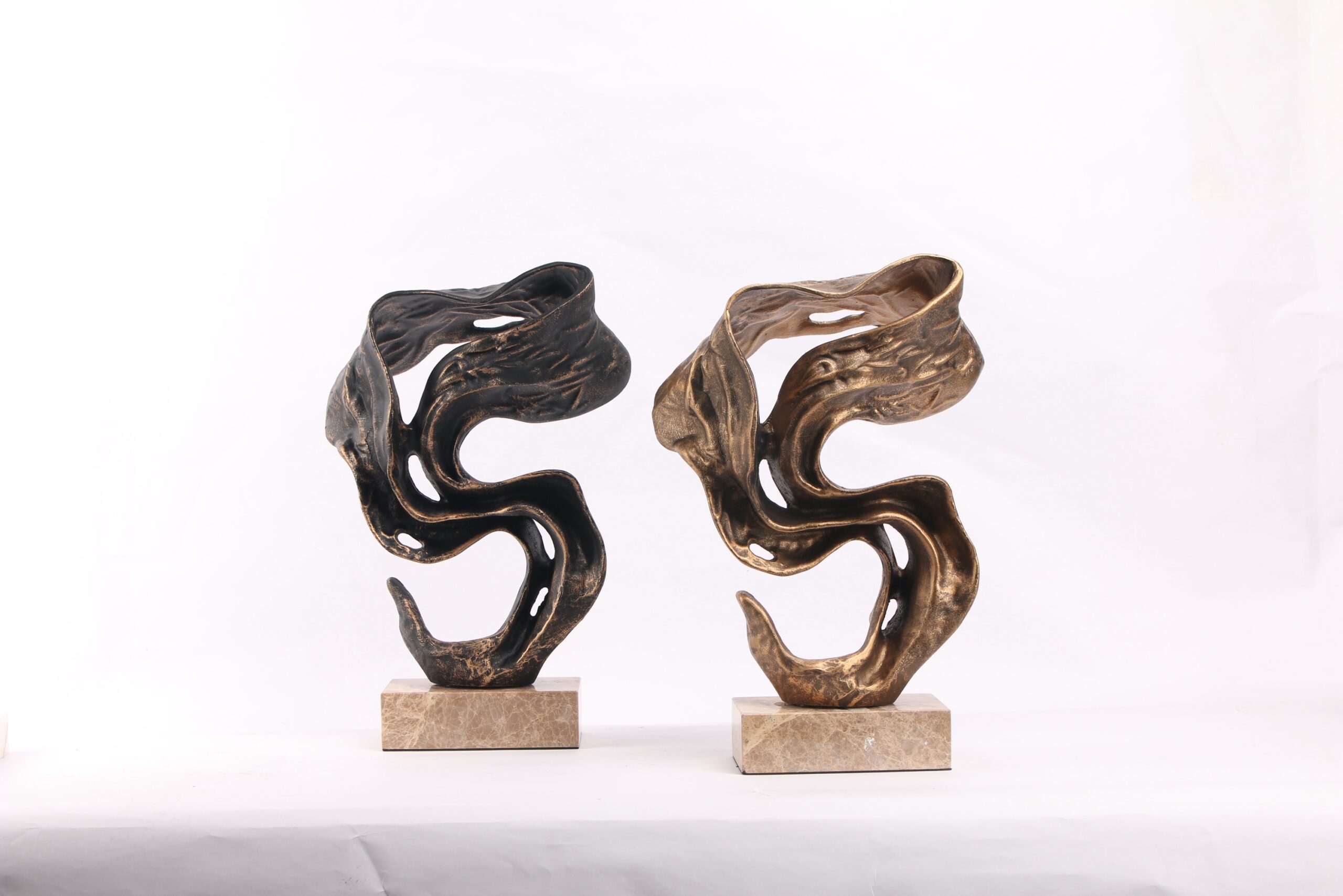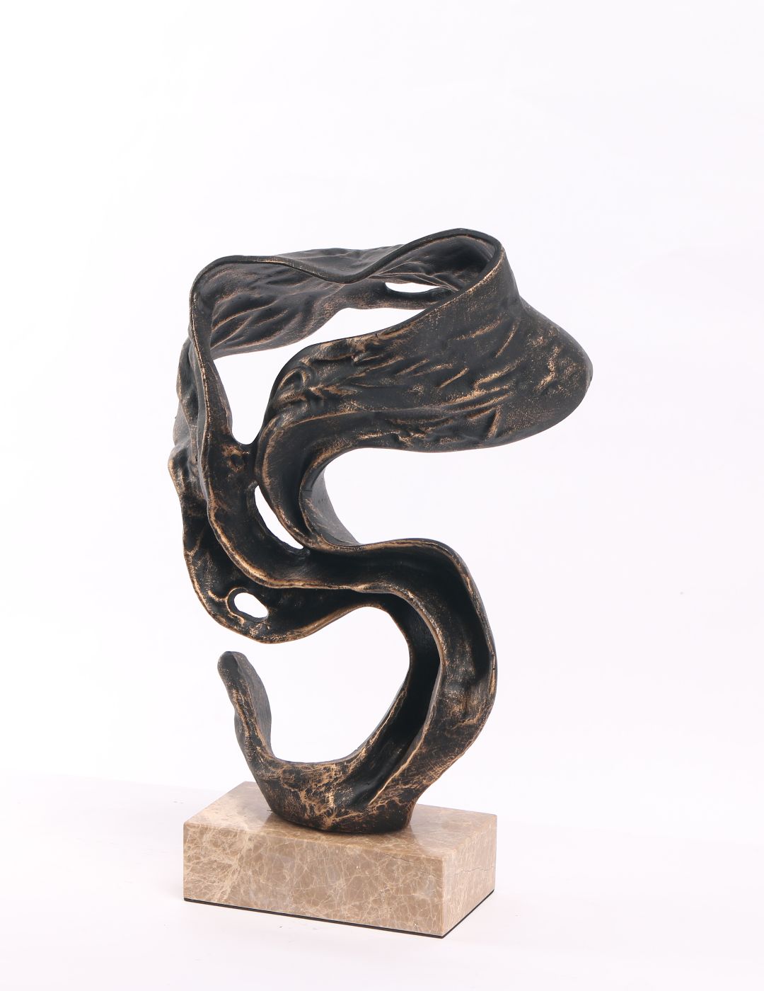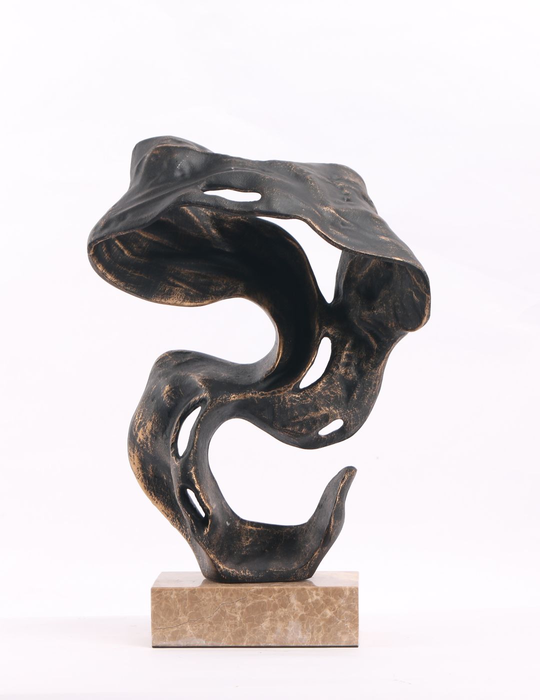 An abstract bronze / charcoal metallic finish sculpture featuring fluid, organic curves set on a natural marble base.