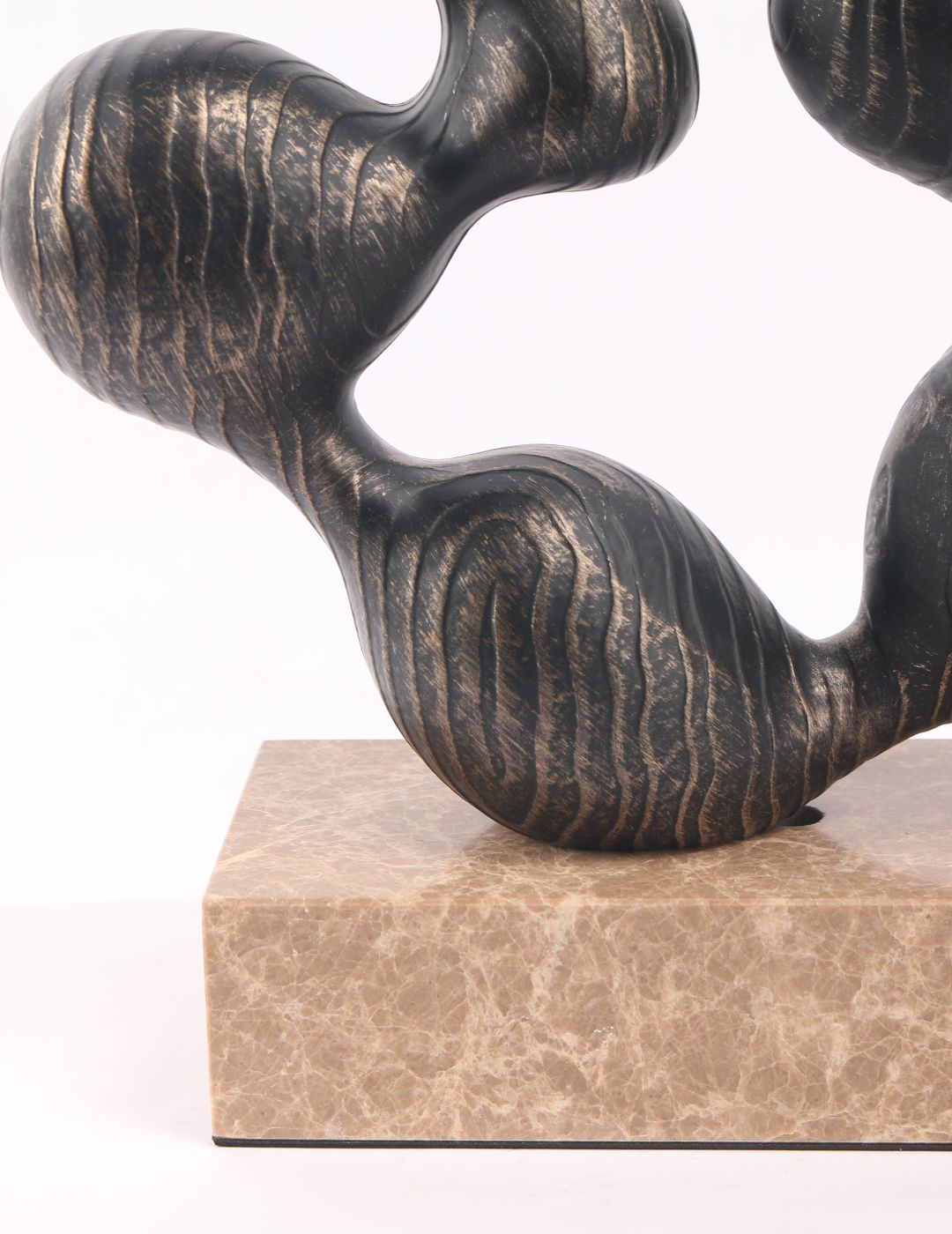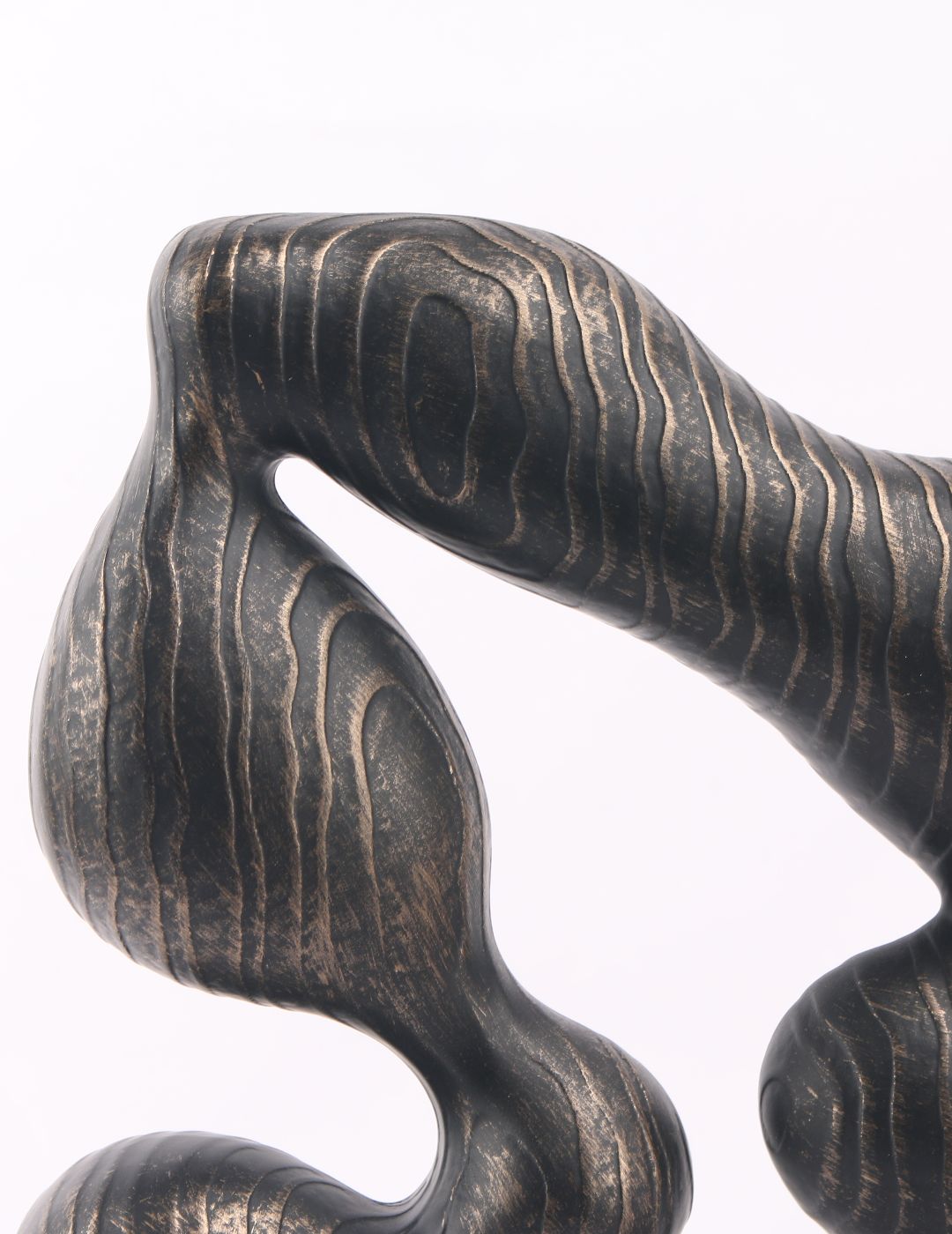 An abstract sculptural piece featuring a deep charcoal finish with subtle wood-grain texture, elegantly set on a natural marble base.