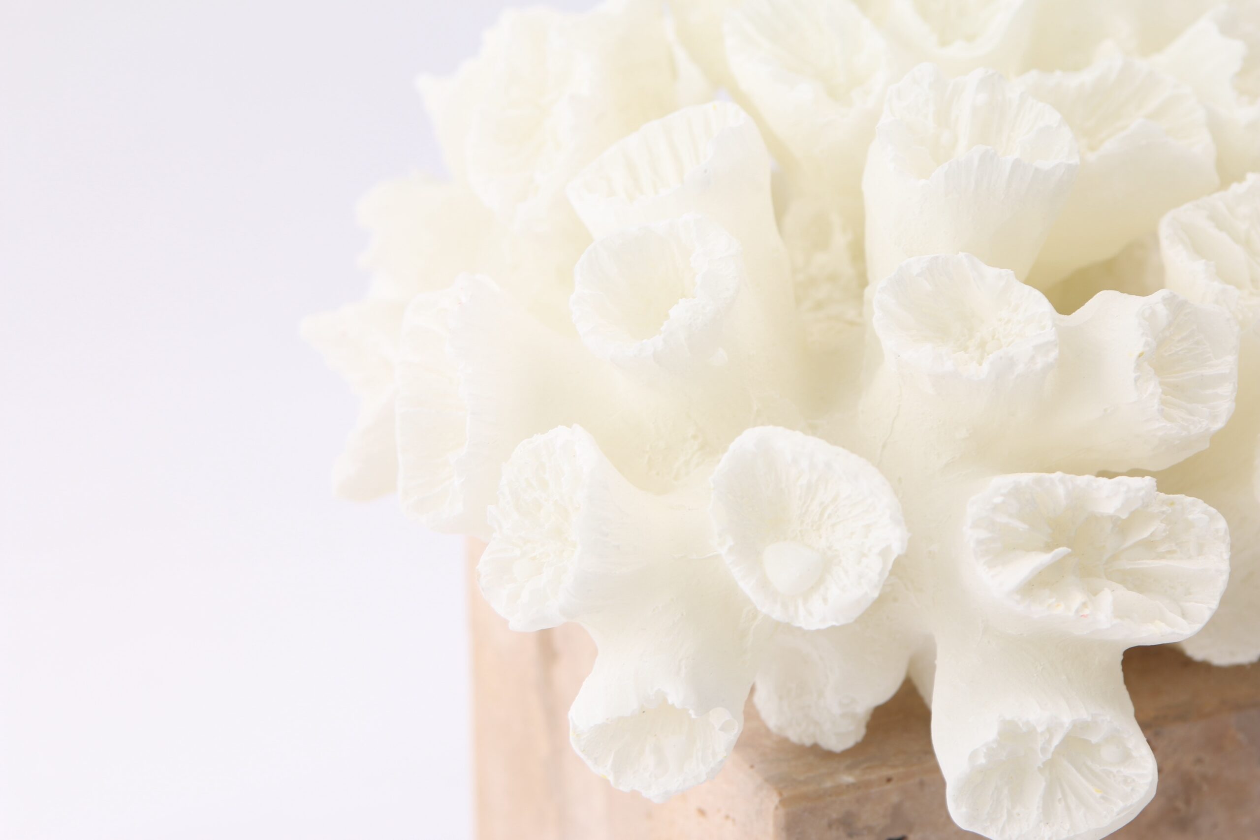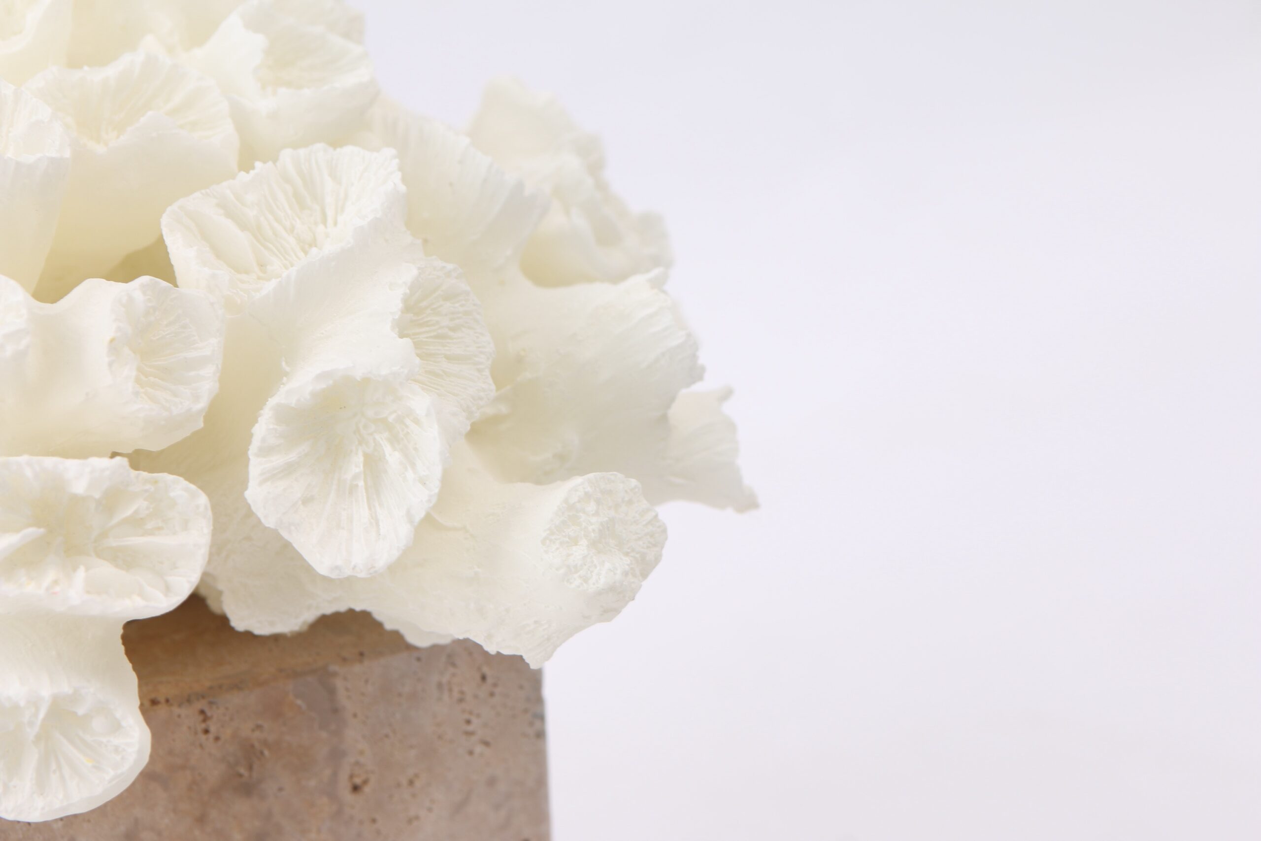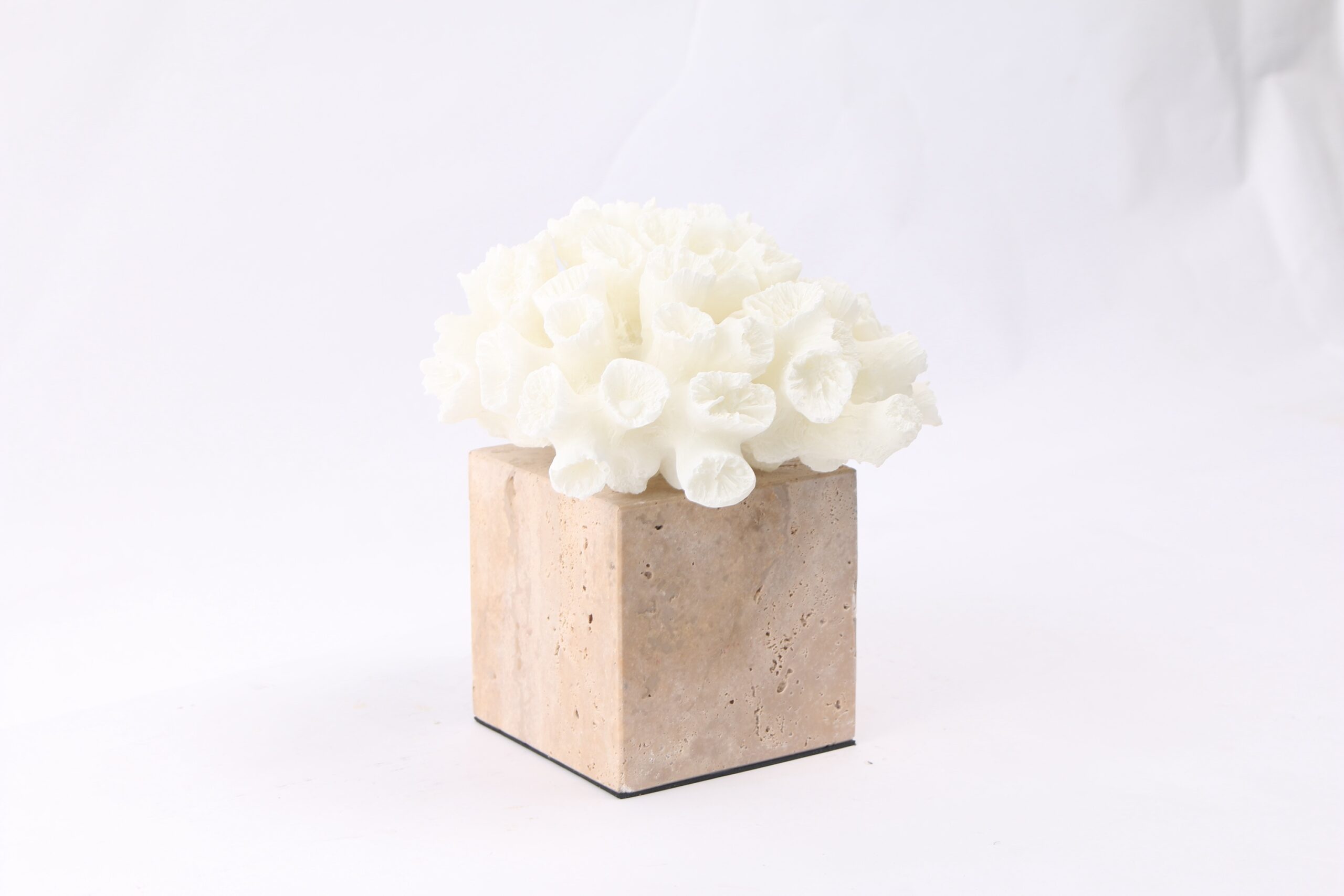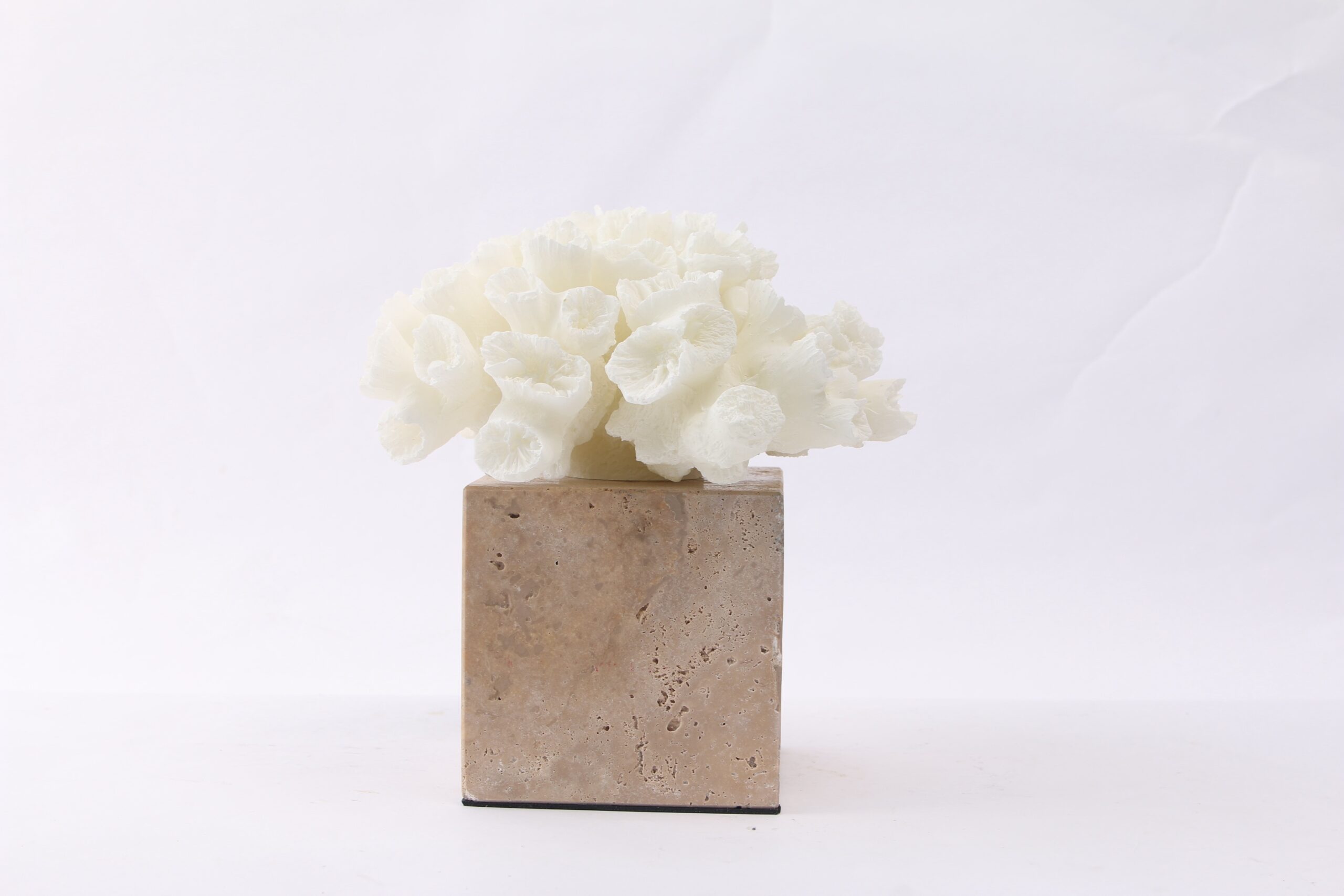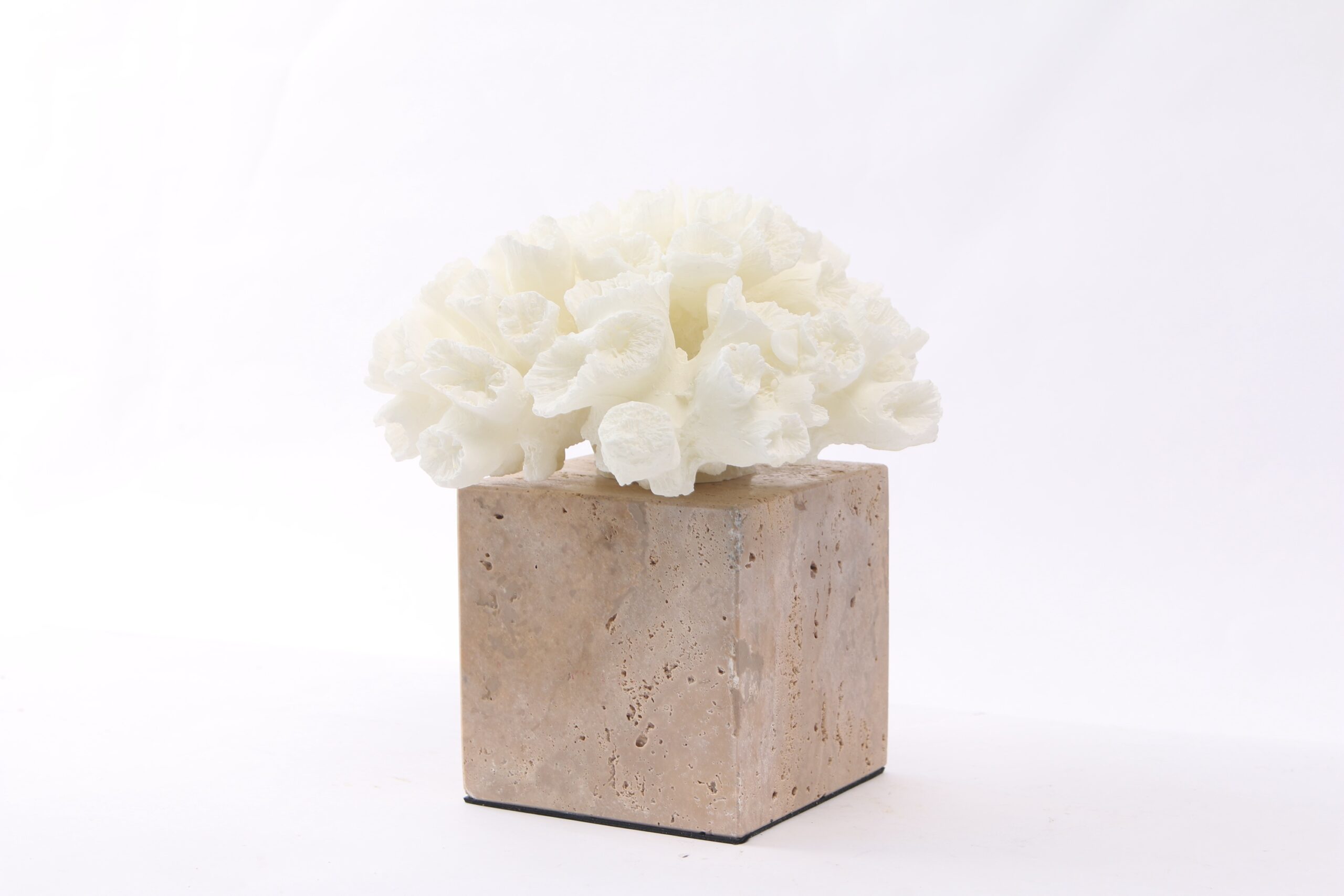 Crafted from raw, porous sand stone, these cuboid vessels provide a weighted, organic foundation for the delicate coral inspired sculpture above. It can be paired with varying height Thalassa II sculpture to create a rhythmic, architectural display that balances the permanence of stone with the ethereal lightness of the sea.